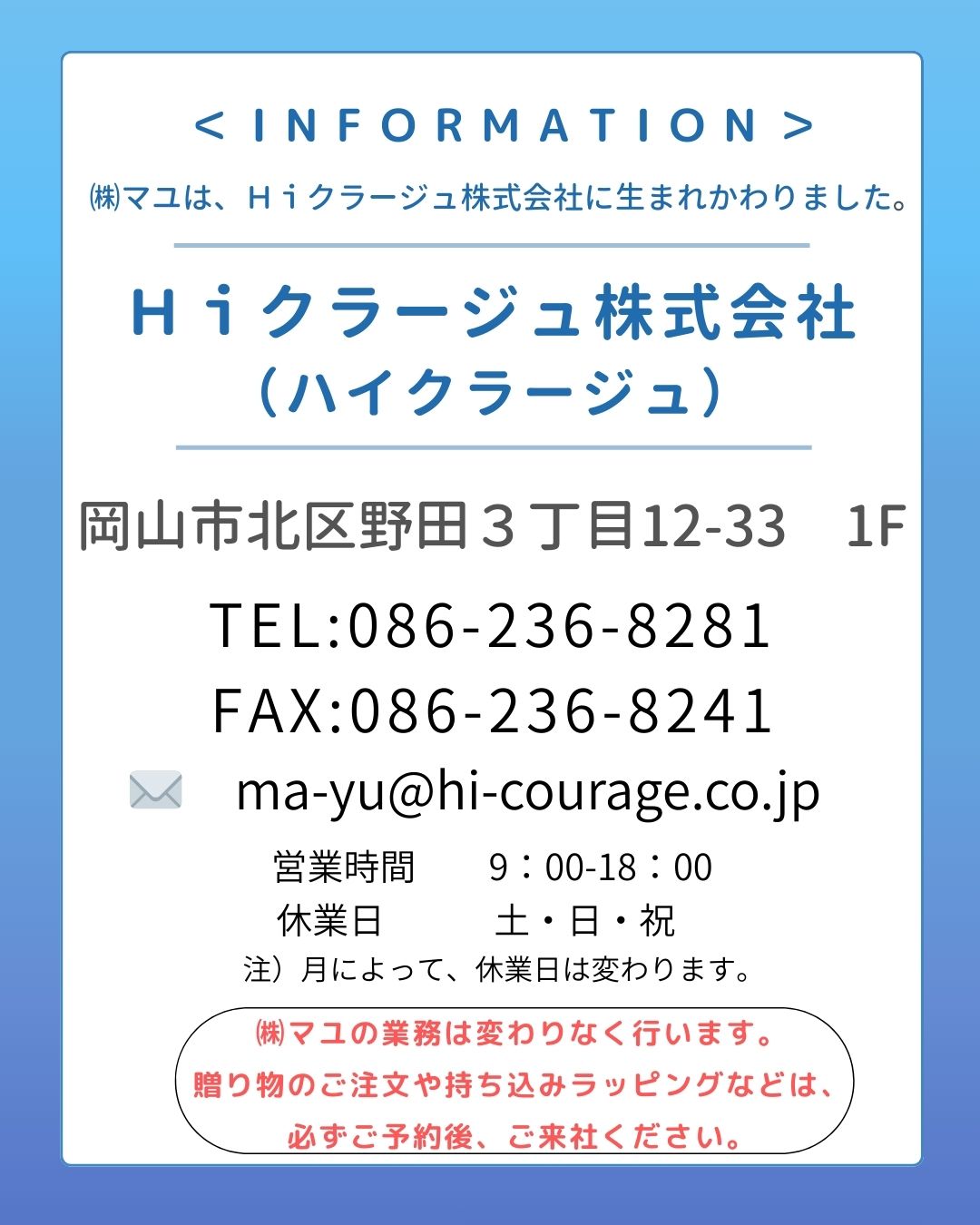㈱マユは、「Hiクラージュ株式会社(ハイクラージュ)」に事業譲渡しました。